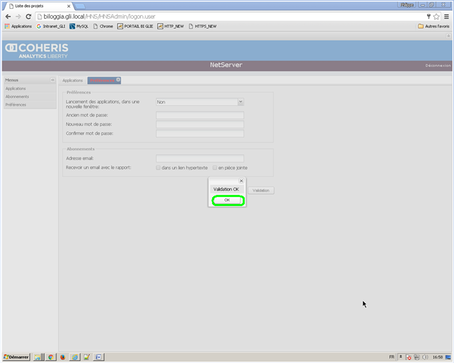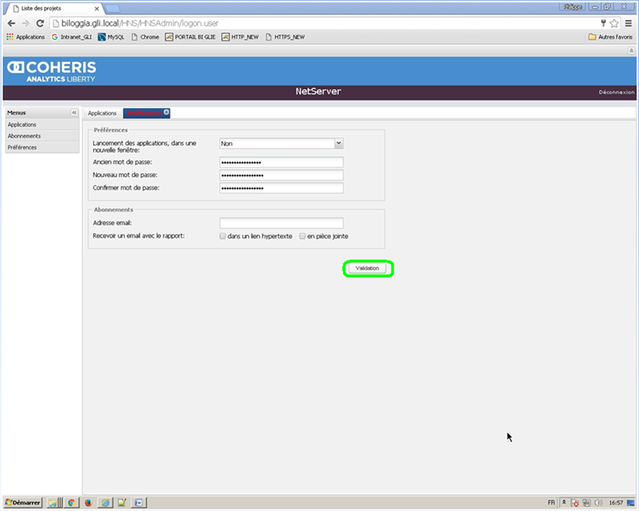 Renseignez votre ancien mot de passe, votre nouveau mot de passe et cliquez sur Validation